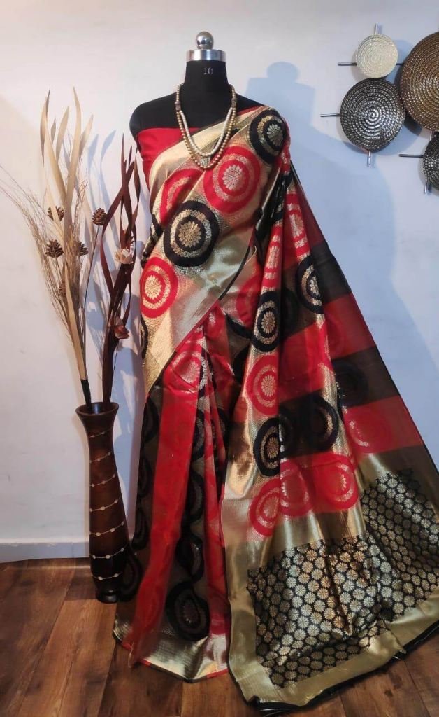 Banarasi Handloom Weaving Silk Saree With Rich Elegant Wooven Pallu n Border With Circle Wooven Pattern With Contrast Patta With Blouse