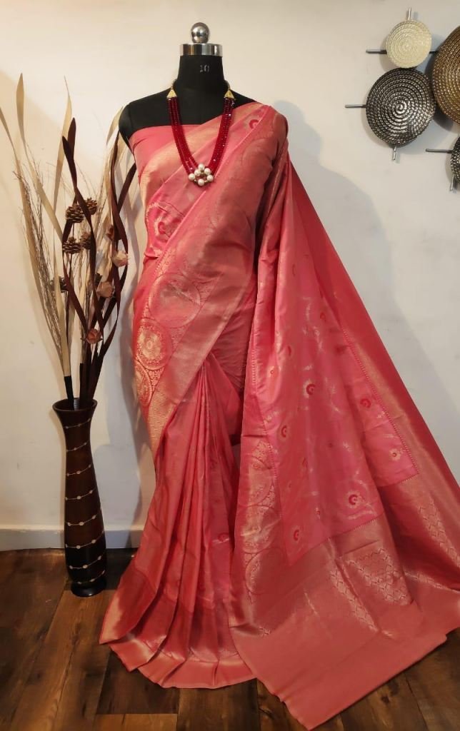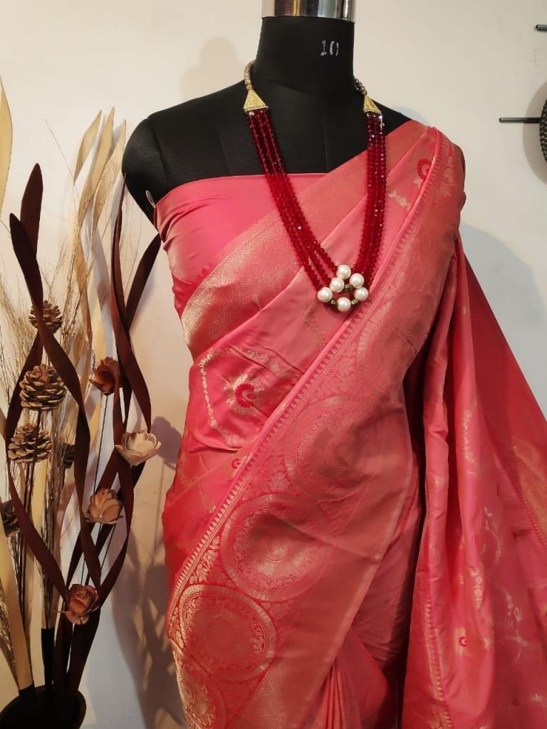 Banasari Handloom Weaving Silk Saree With Zari Contrast Wooven Pallu n With Heavy Wooven Border With All Over Jaal Meenakari Weaves With Contrast Blouse