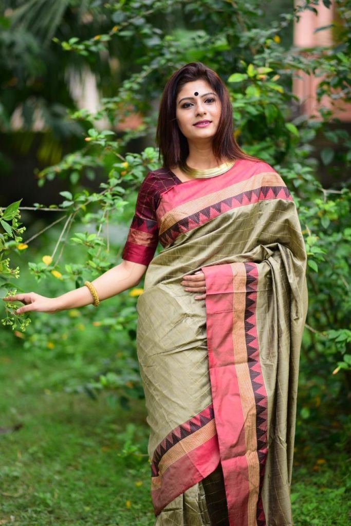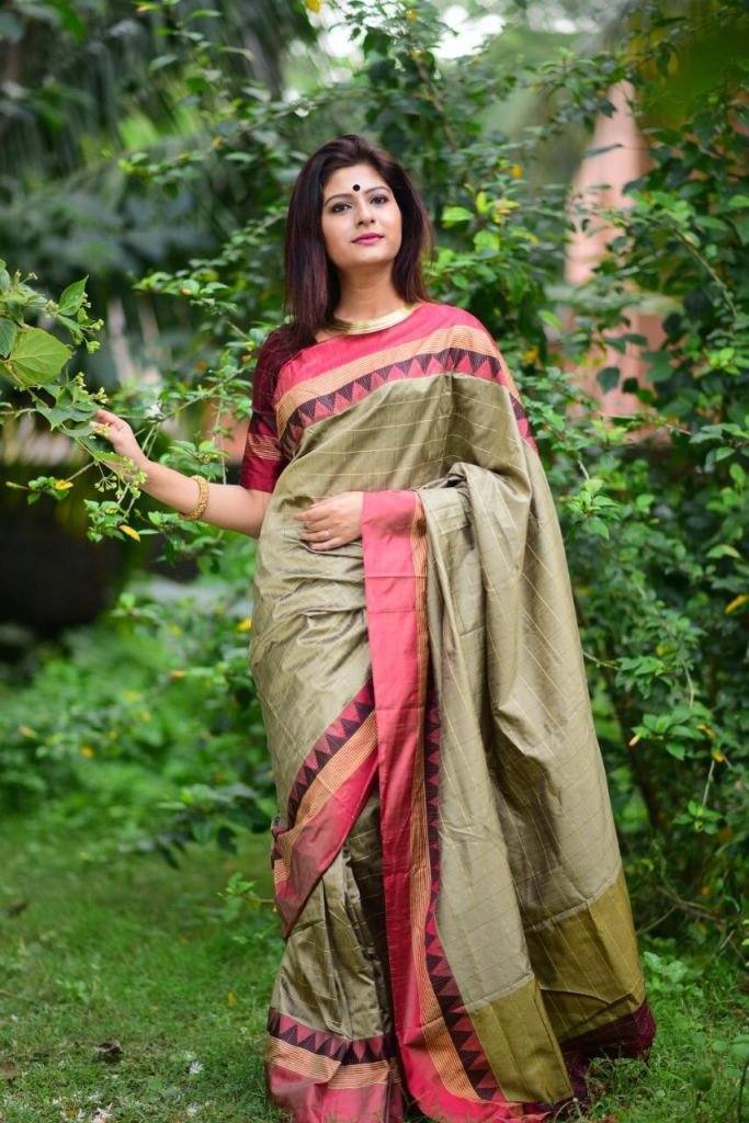Banglori Raw Silk Saree With Contrast Zari Wooven Pallu With Royal Tassels n Contrast Khadi Wooven Border n Check Contrast Blouse