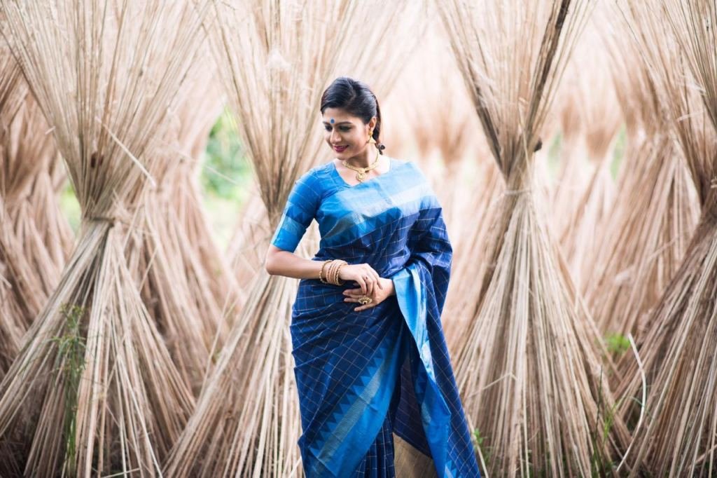 Banglori Raw Silk Saree With Contrast Zari Wooven Pallu With Royal Tassels n Contrast Khadi Wooven Border n Check Contrast Blouse