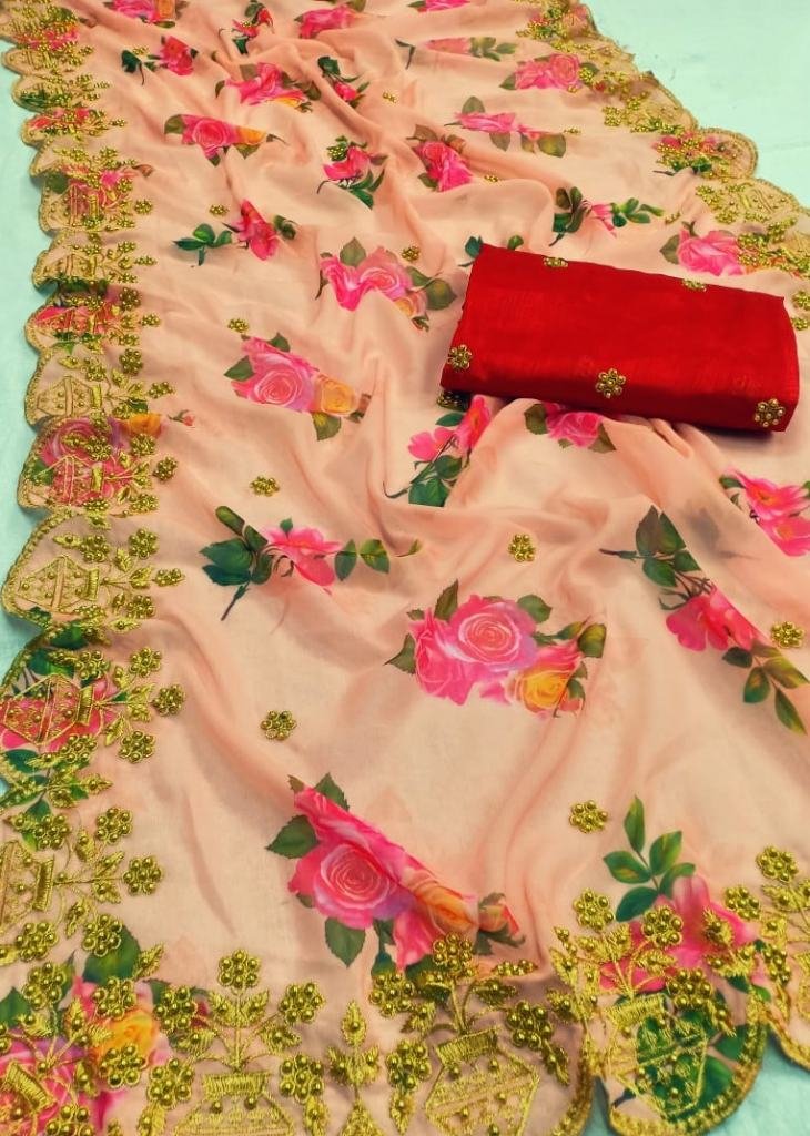 By Online beautiful pure Gseorrgte digital Printed Hand Work saree at best price from surati fabric