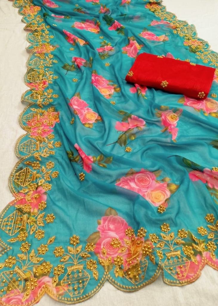 Georgette Digital Printes It has all over hand work throughout the body and cutwork border which work is made it with multy and with handstone work..