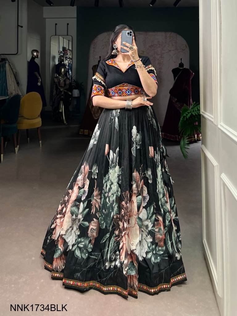 Lehenga Work : Floral Print With Paper Mirror Lace Touch Up