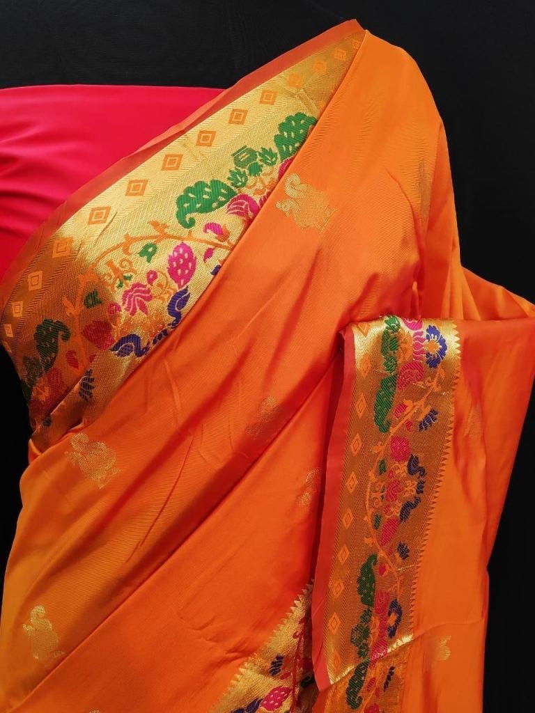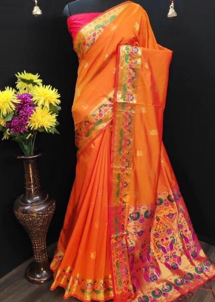 Buy Online Designer Paithani Lichi Silk Orange Color Saree At Best Price From Surati Fabric.