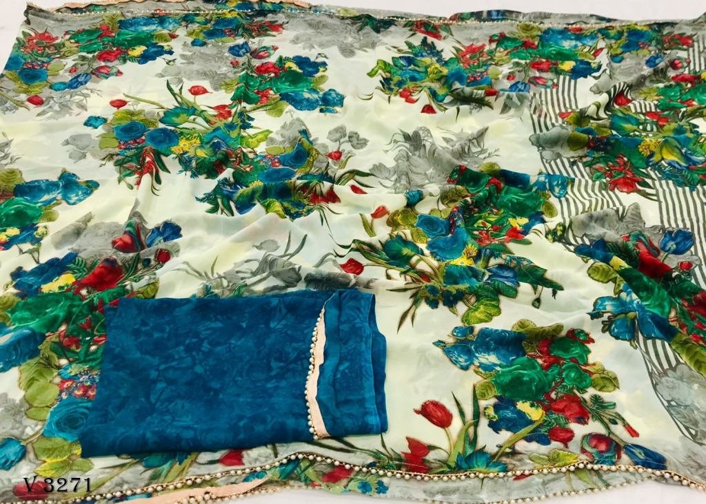 Georgette Floral With Beads Lace Blue Saree By Surati Fabrics