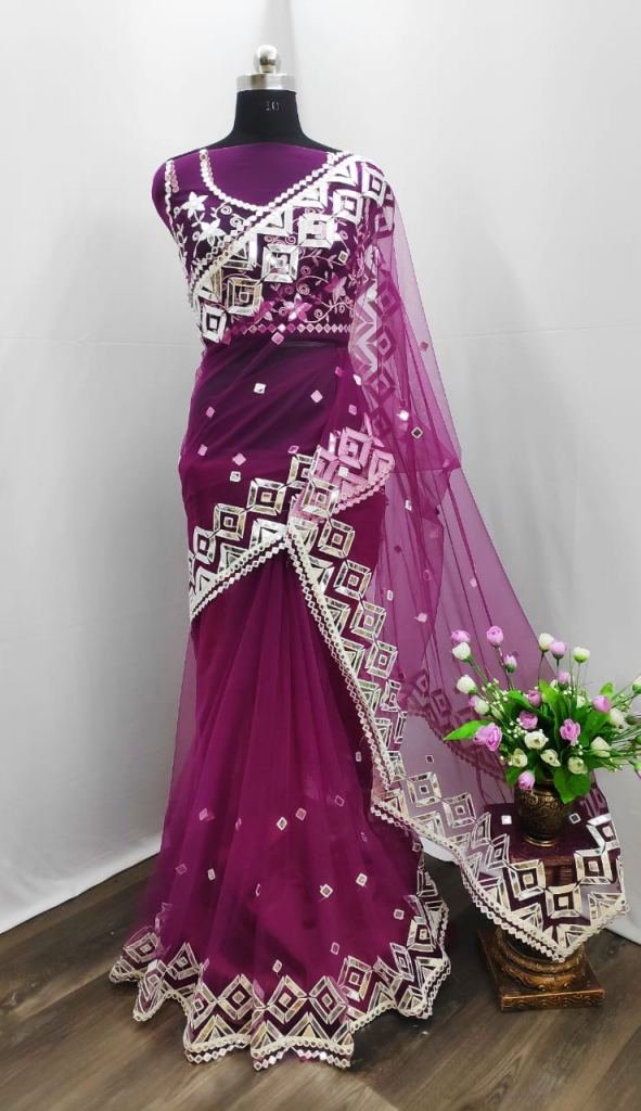 Full saree of heavy quality Premium net with heavy Premium embroidery Mirror Viscous Thread work
