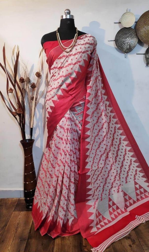 Handloom Cotton Weaving Saree With Contrast Goemetric Wooven Pallu With Temple Wooven Border With Plain Contrast Blouse