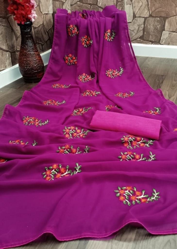 Buy Online Indian Glory Geogette Flower Work Rani color Saree At Best Price From Surati Fabric.