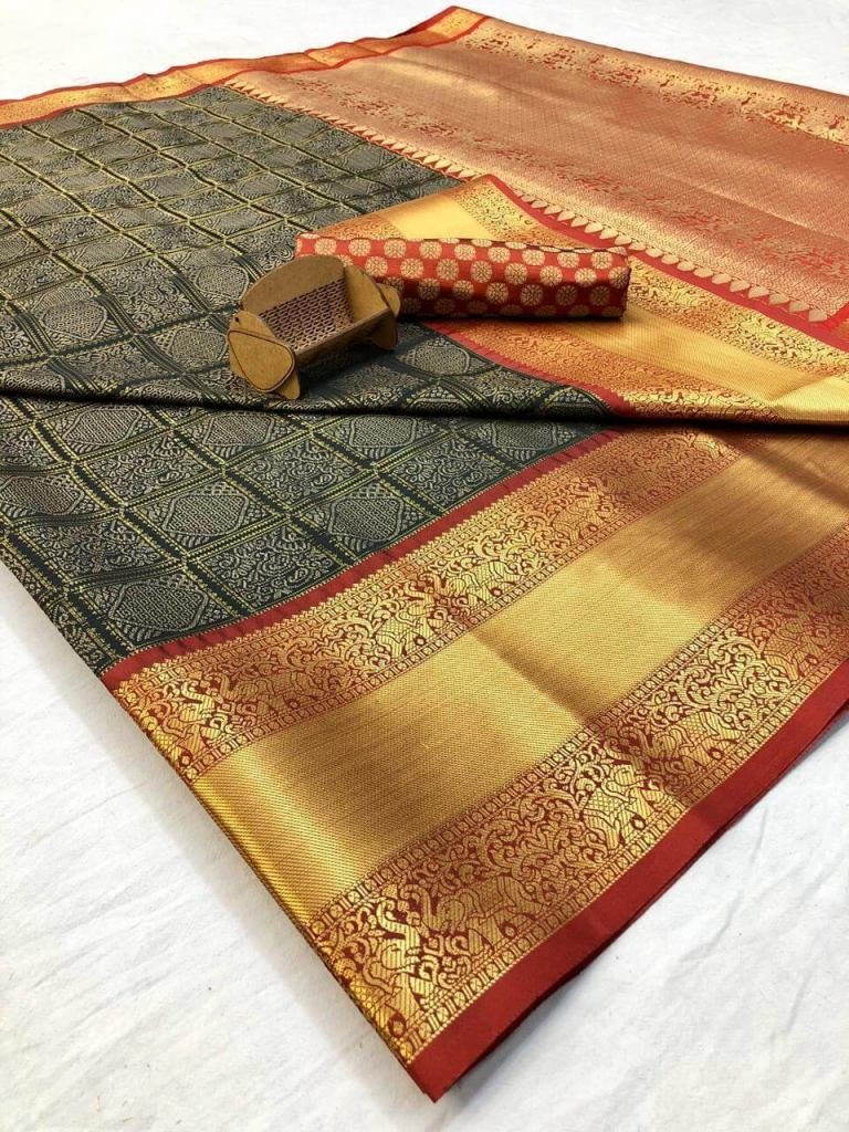 Kanchipuram Handloom Weaving Silk Saree With Rich Contrast Zari Wooven Pallu n Rich Zari Wooven Border With Figure Desgin n Contrast Barcode Blouse