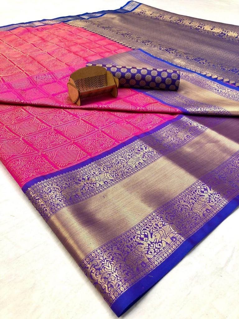Kanchipuram Handloom Weaving Silk Saree With Rich Contrast Zari Wooven Pallu n Rich Zari Wooven Border With Figure Desgin n Contrast Barcode Blouse