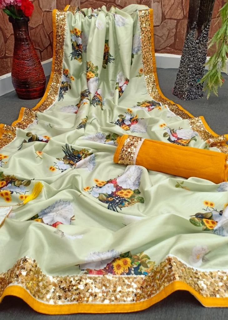 Puredevsena sillk satin saree with digital print & Hanging Sequence less With Satin Banglori Piping And Beautiful Latkan