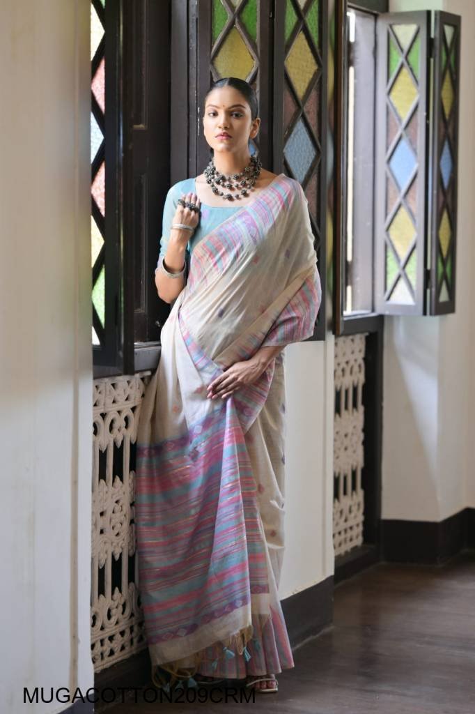 Premium soft muga Cotton saree with Colourfull weaving ikkat border and all over resham weaving butties and classic colourfull weaving pallu and fancy tassels with Contrast blouse piece