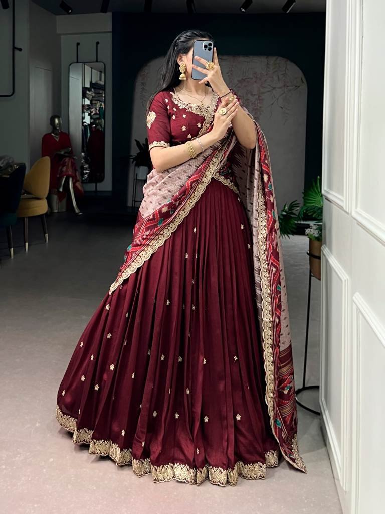 Dupatta work : Ikkat Printed & Foil Printed With Sequins and Thread Embroidery Work Lace Border