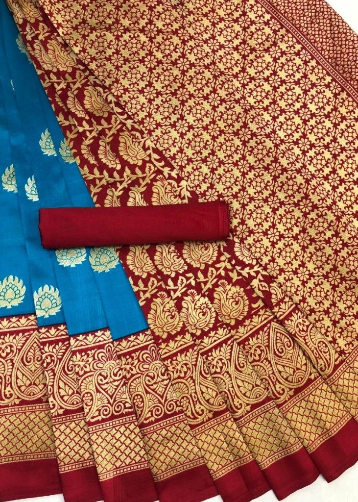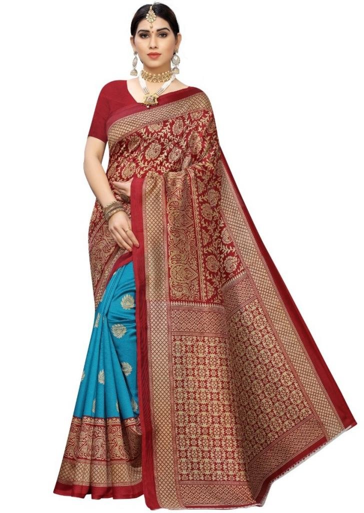 BUY ONLINE SKY BLUE & RED COLOR ART SILK PRINTED SAREE SOLID DESIGN WITH BORDER BY SURATI FABRIC AT BEST REASONABLE PRICE.