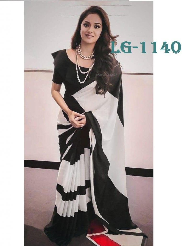 NEW HOT BLACK AND WHITE FANCY BOLLYWOOD COLLECTION ULTRA SATIN PRINTED SAREE WITH BLOUSE LAUNCH BY LEMBOGEE