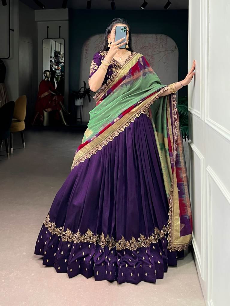 Lehenga (Stitched) Lehenga Fabric : Vichitra Silk Lehenga Work : Sequins and Thread Embroidery Work Lehenga Waist : SUPPORTED UP TO 42 Lehenga Closer : Drawstring With Zip Stitching : Stitched With Canvas and attached with Can Can Length : 41 Flair : 3.50 Meter Inner : Micro Crepe Blouse (Unstitched) Blouse fabric : Vichitra Silk Blouse Work : Sequins and Thread Embroidery Work Blouse Length : 1 Meter Dupatta Dupatta Fabric : Vichitra Silk Dupatta work : Foil Printed With Sequins and Thread Embroidery Work Lace Border Dupatta Length : 2.40 Meter Package Contain : Lehenga, Blouse, Dupatta, Drawstring With Zip